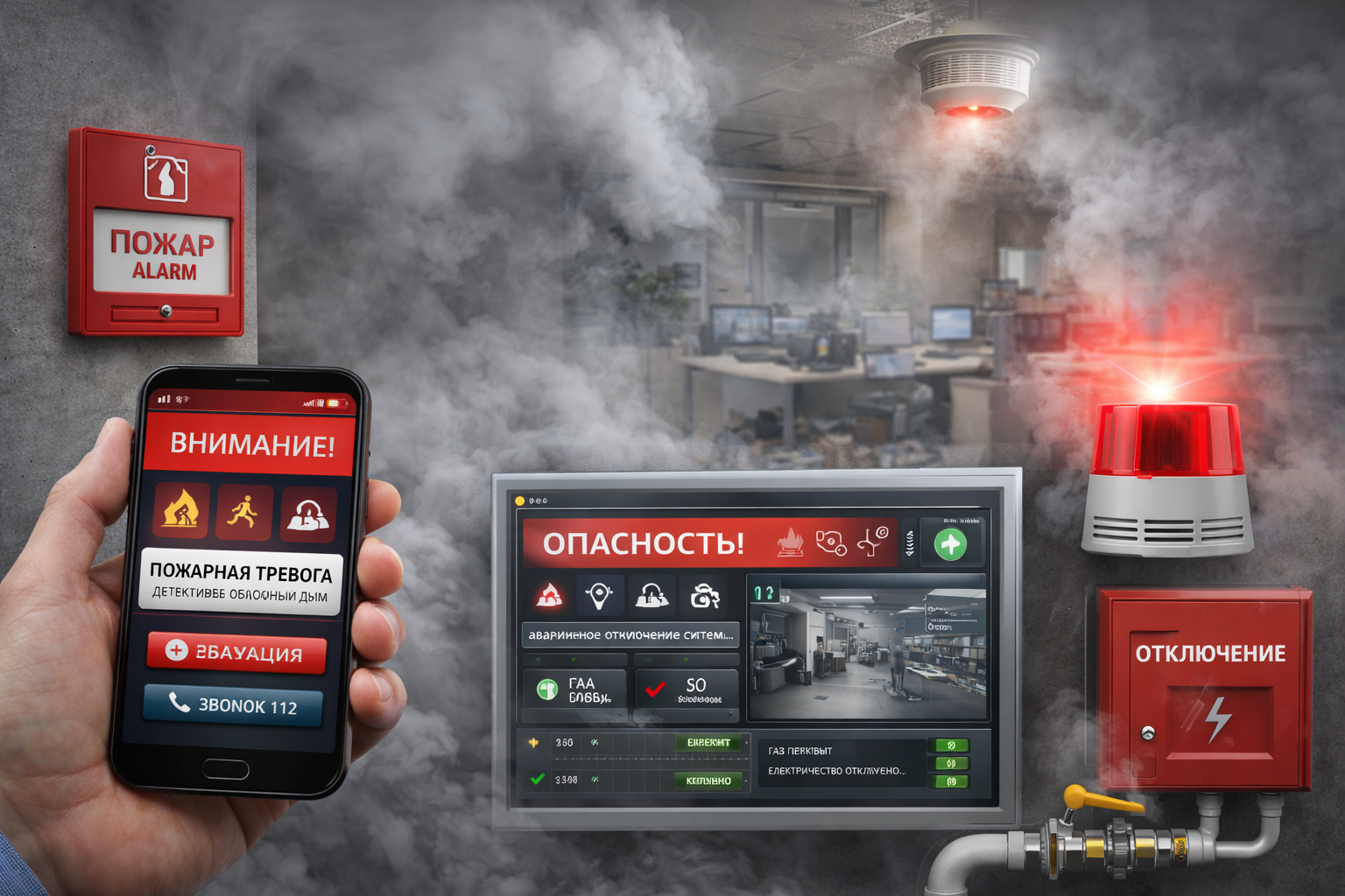 Дым, газ, CO₂, автоматическое оповещение и отключение опасных систем.